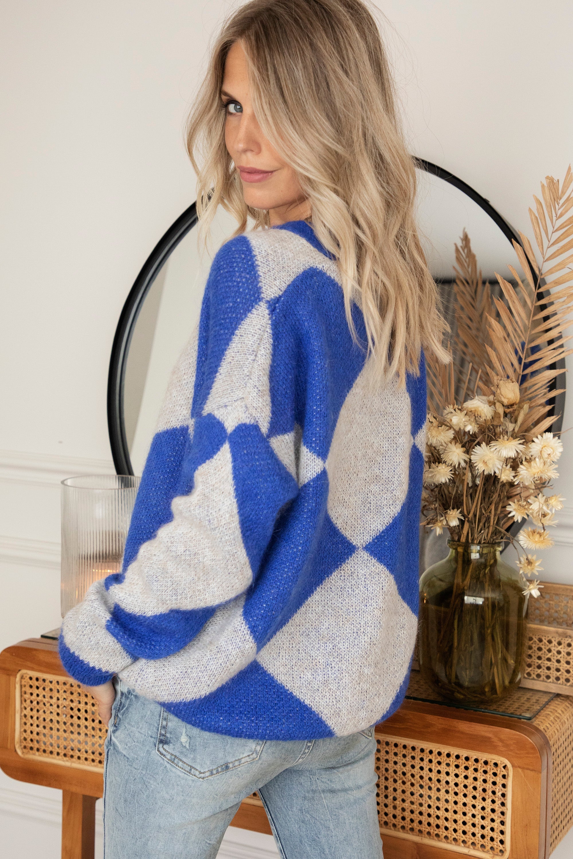 Dit vest combineert beige en donkerblauwe squares! Een super mooie combinatie 😍