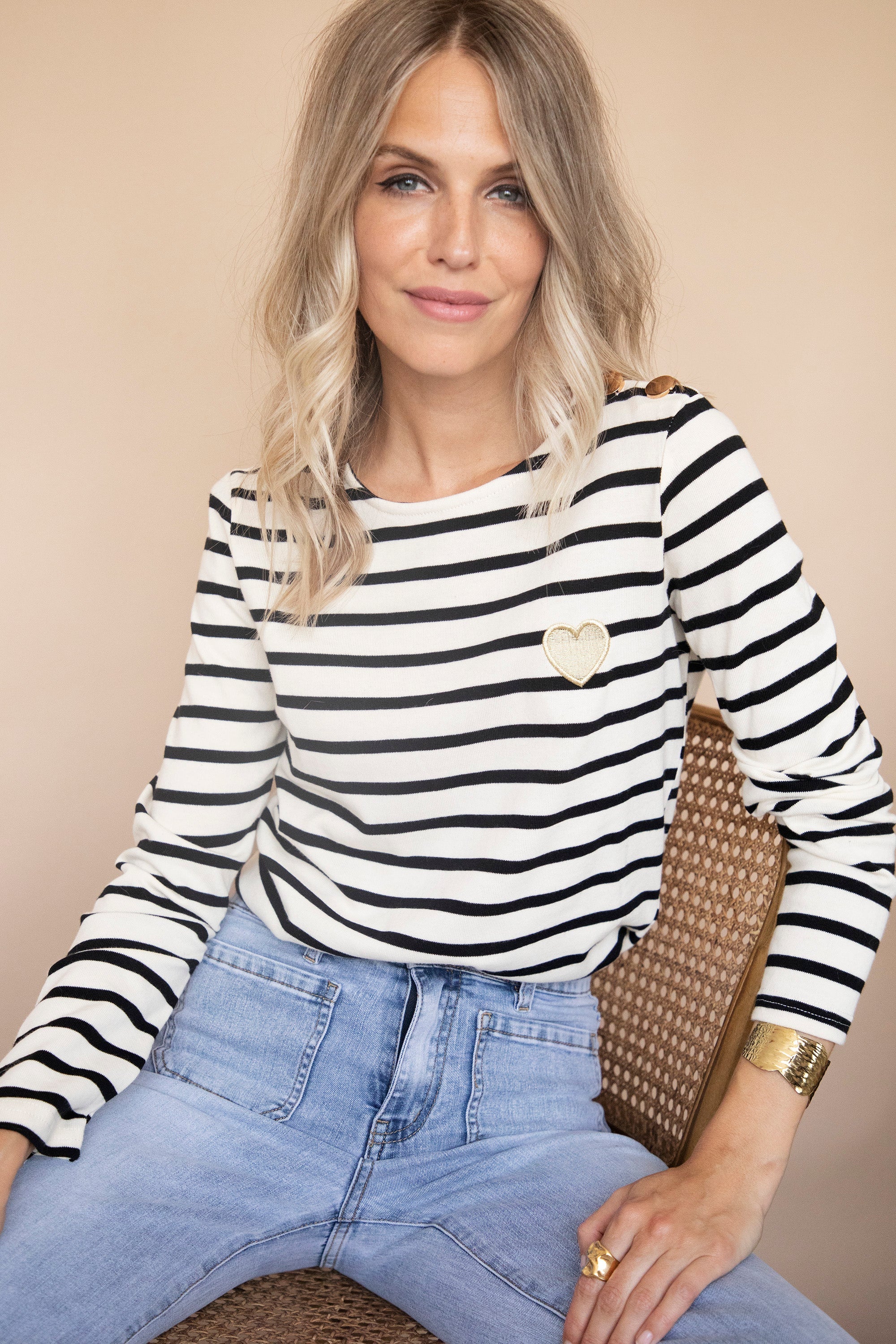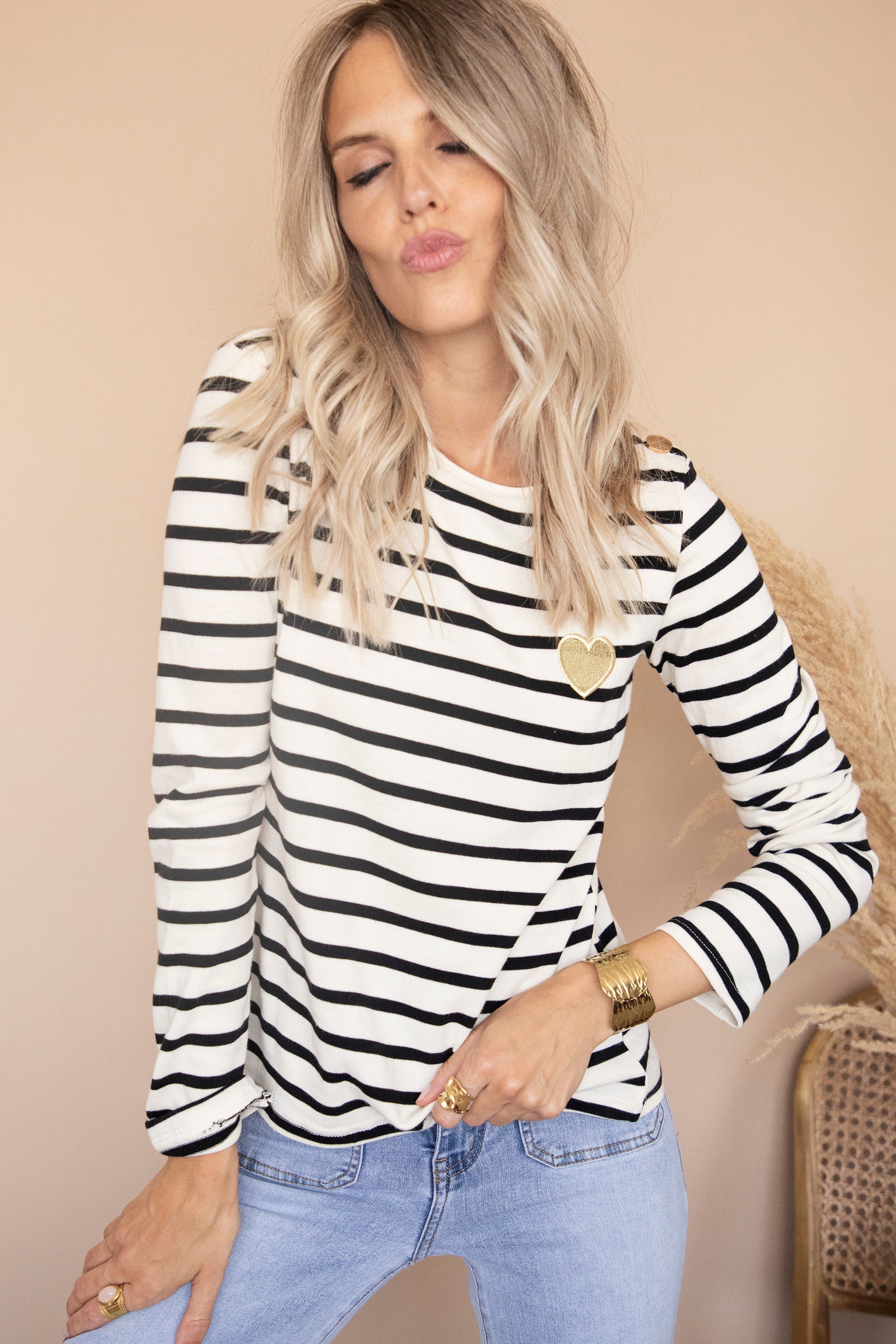 Van dit longsleeve krijg ik wel een beating heart hihi! De 'Beating Heart' collectie heb ik al een tijdje in de ellemilla collectie omdat het zo'n fijne stukken zijn! Het gouden hart typeert de collectie, een super cute detail 🖤 Dit exemplaar wordt extra geliefd door een zwart streeppatroon en twee gouden knopen aan de schouder!
