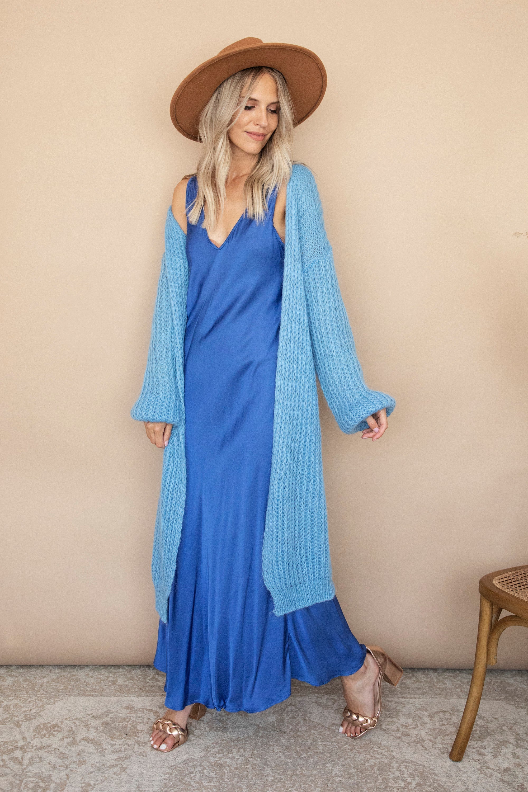 Kijk even hoe leuk ze staat op de donkerblauwe satijnen maxi jurk! 💙 Geeft een leuk contrast!