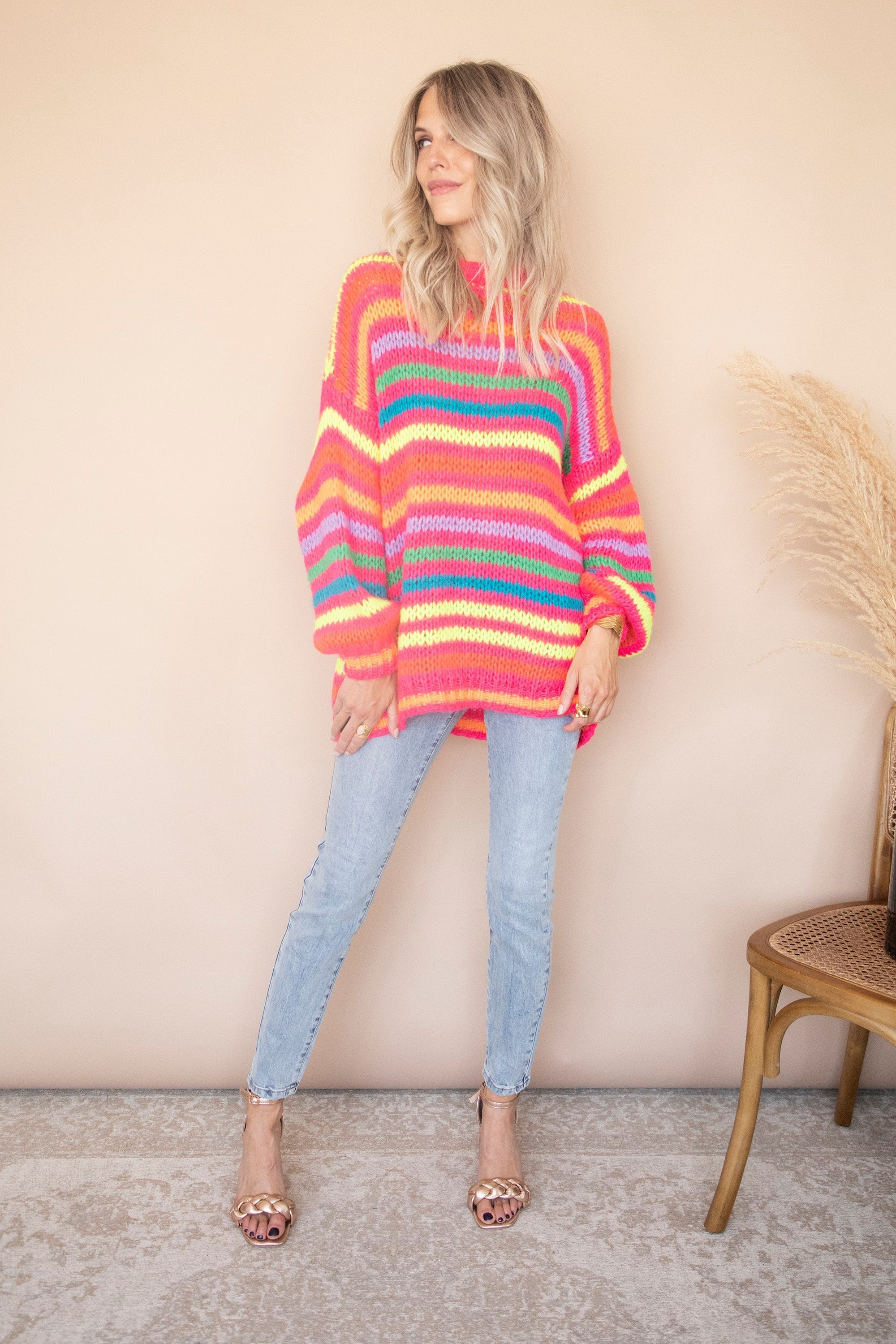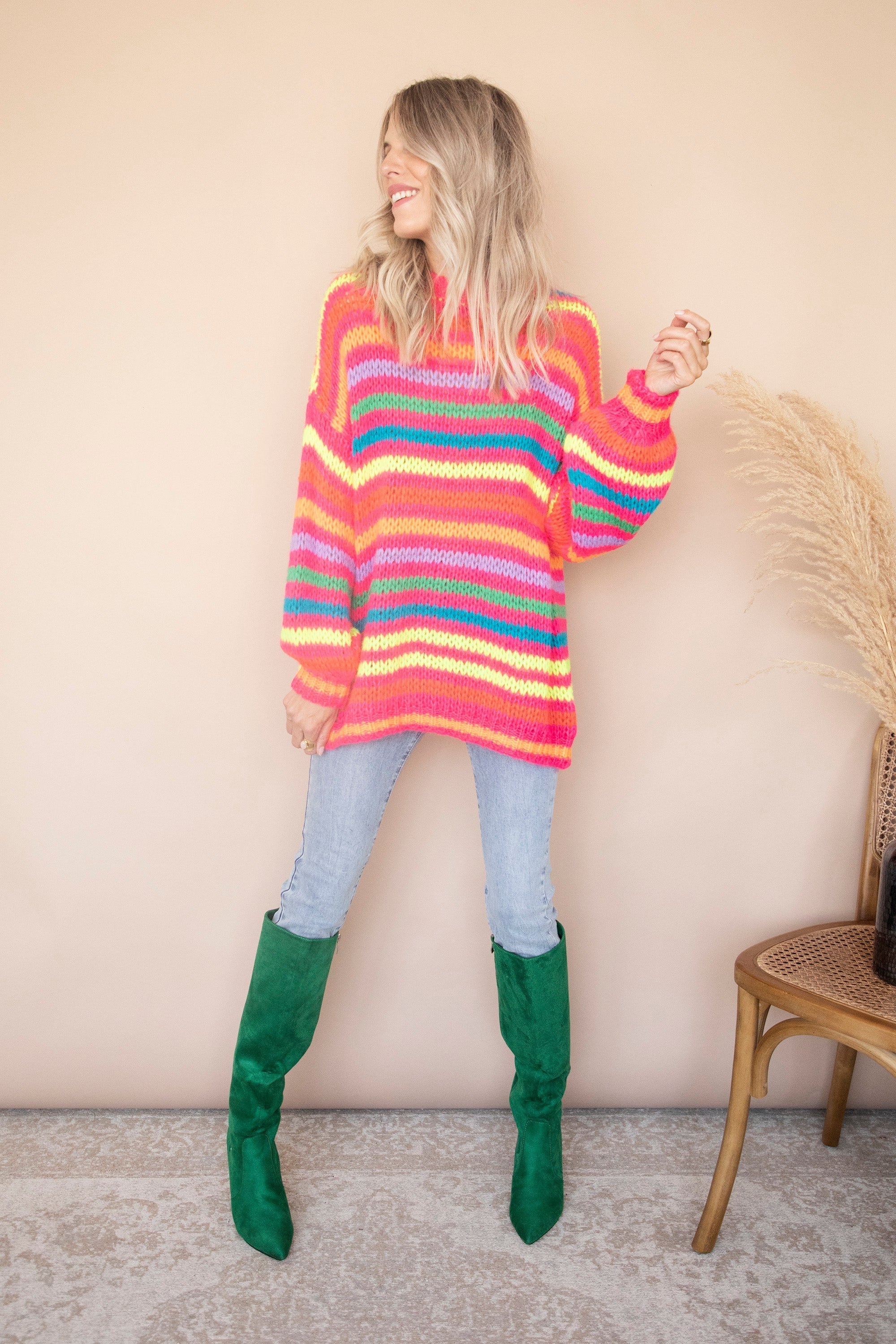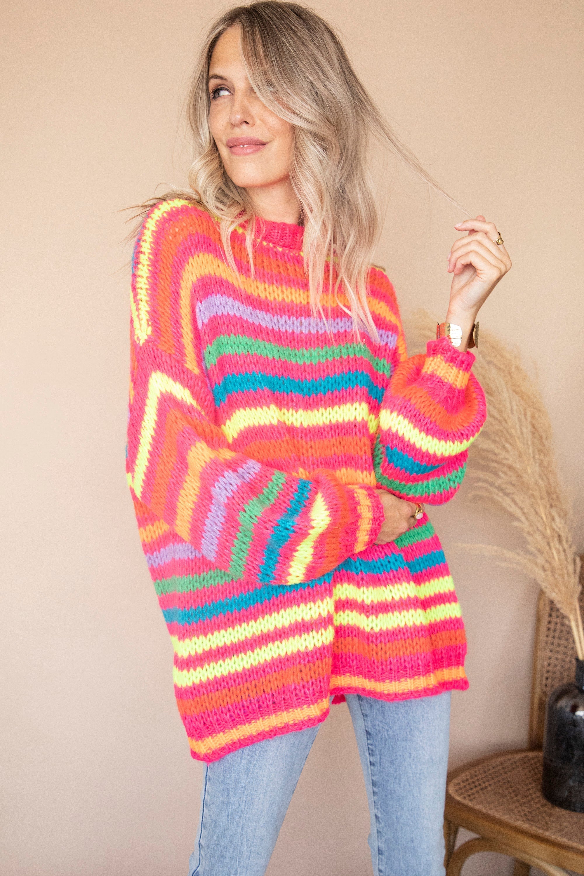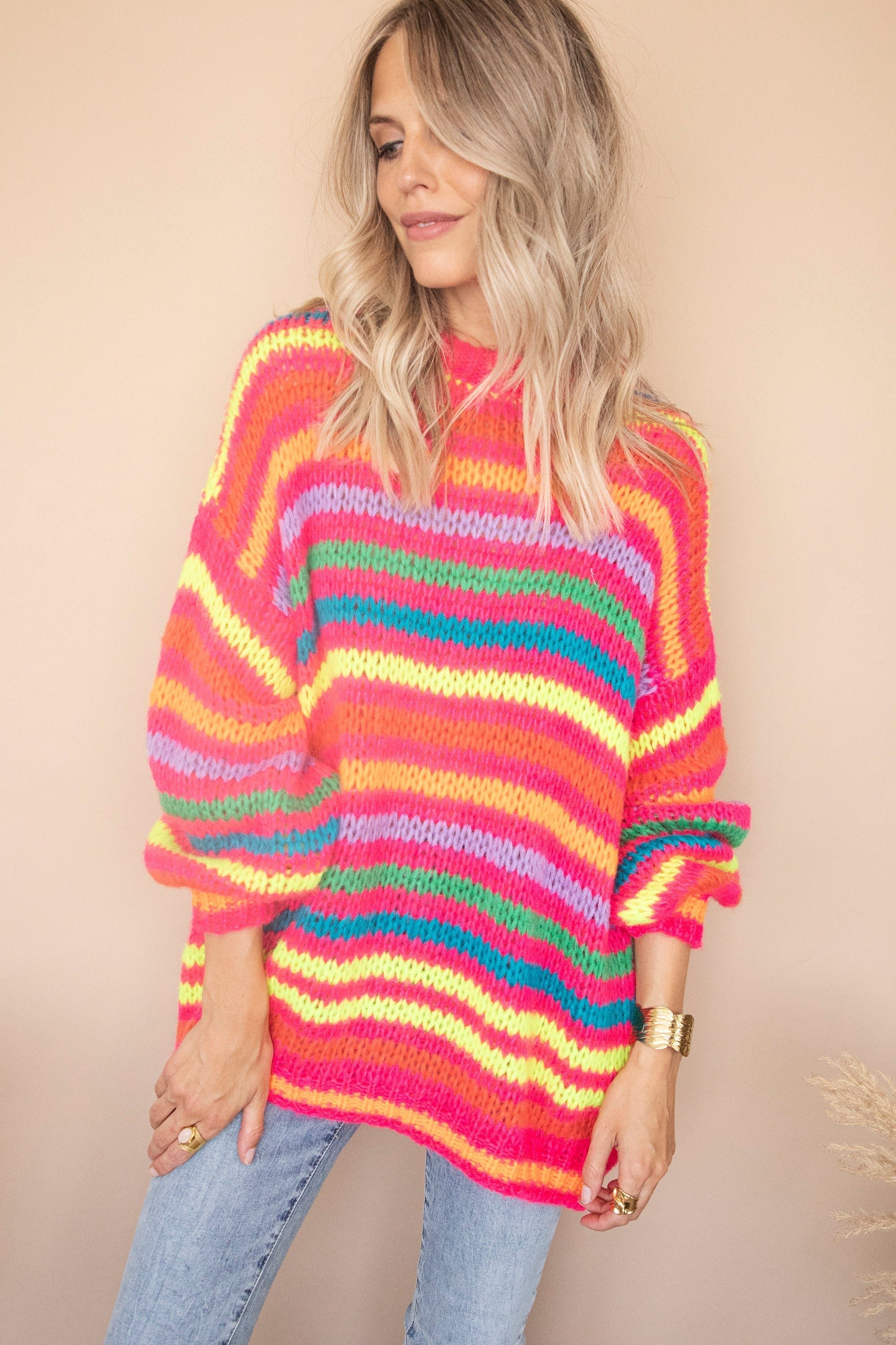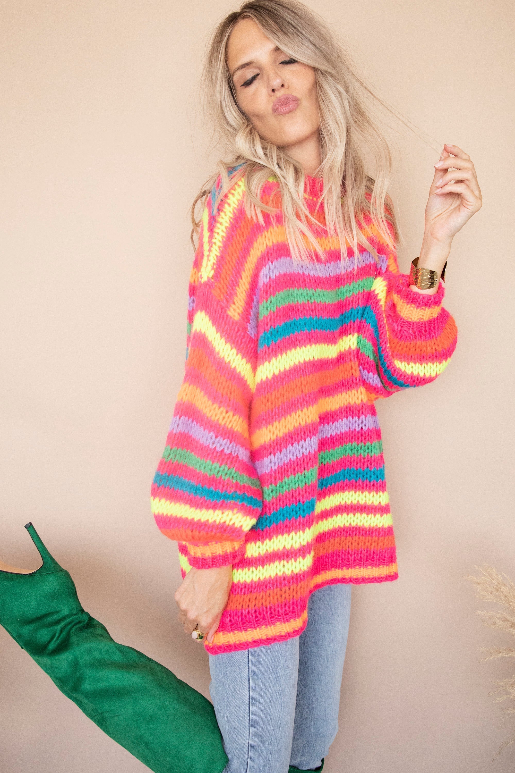 Je kan er niet naast kijken hihi, de volledige trui kreeg een flinke boost dankzij een fluo mix van fuchsia, geel, groen, blauw, oranje en lila strepen! 🌈 LOVE IT!