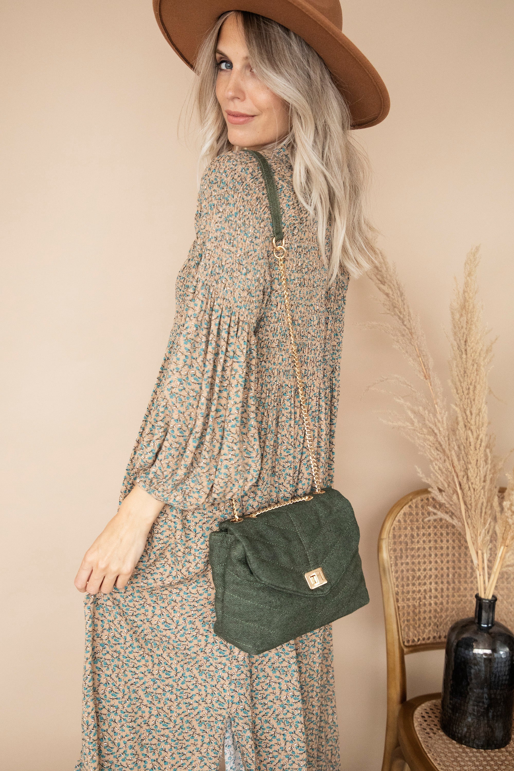 De volledige jurk is opgefleurd met een kleurrijk bloemendessin van petrol & camel 🌿 Vind ik zo'n mooie combinatie!