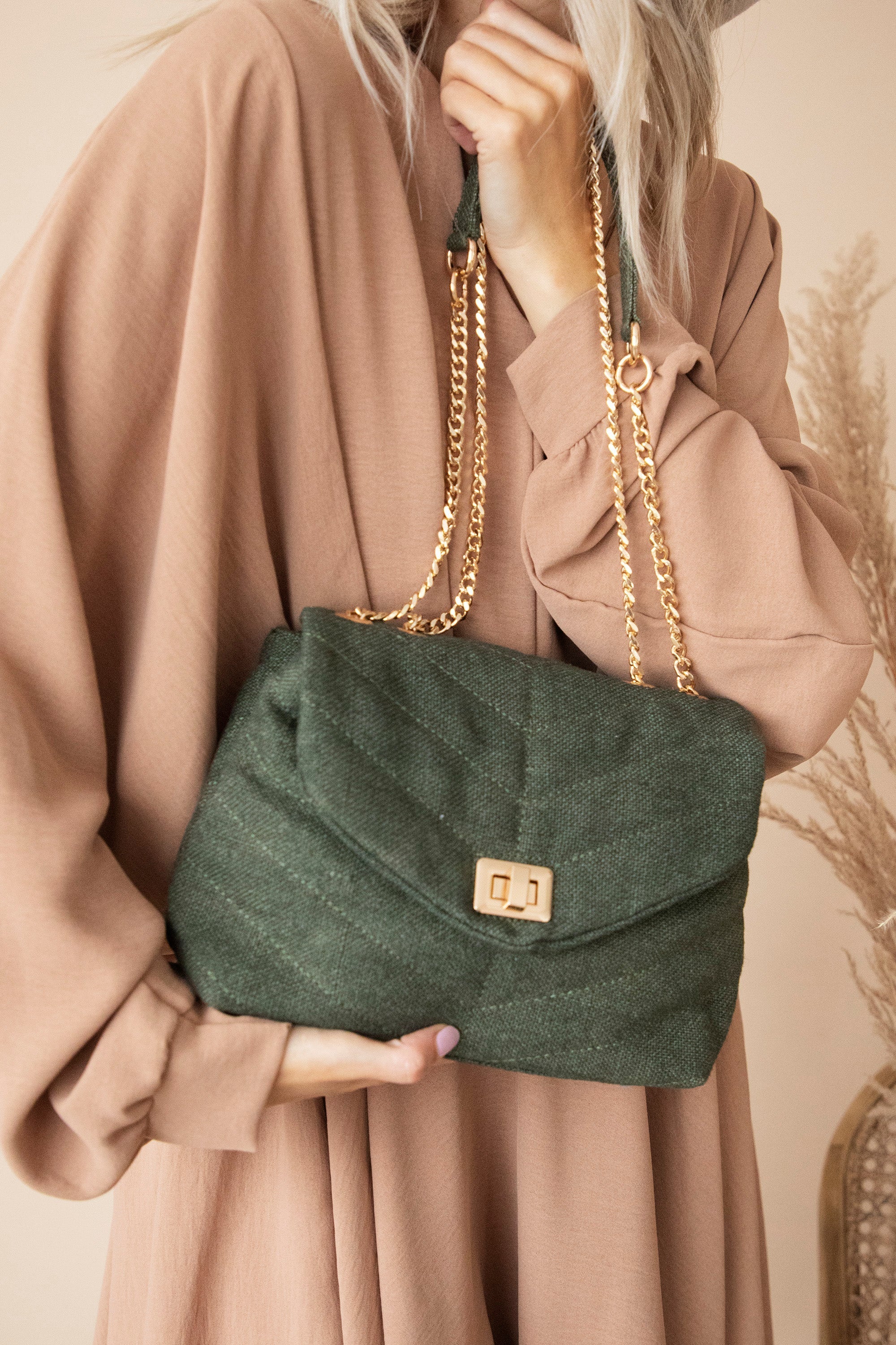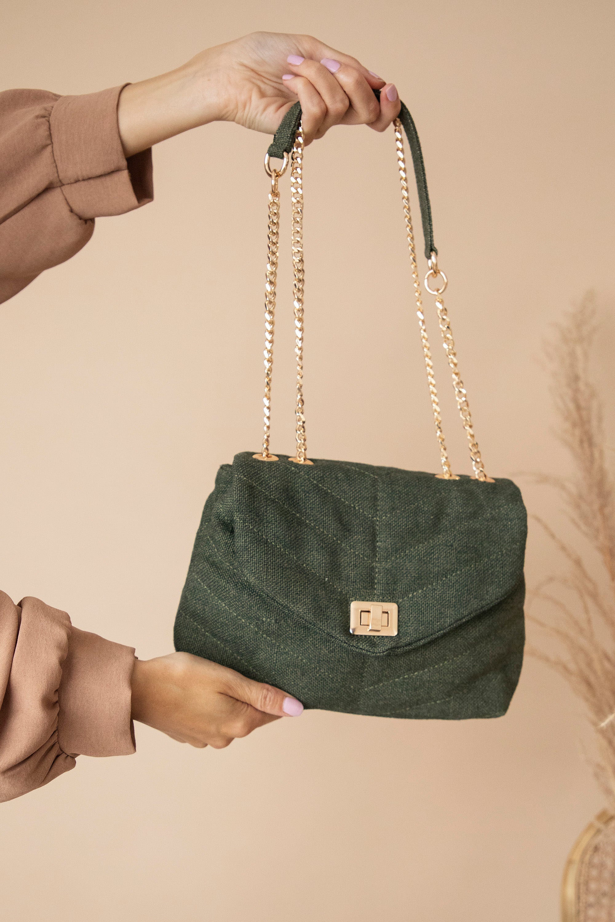 Draag de handtas rond je schouder door de gouden ketting lang te houden of draag in je handen door de twee gouden kettingen gelijk te maken đÂ