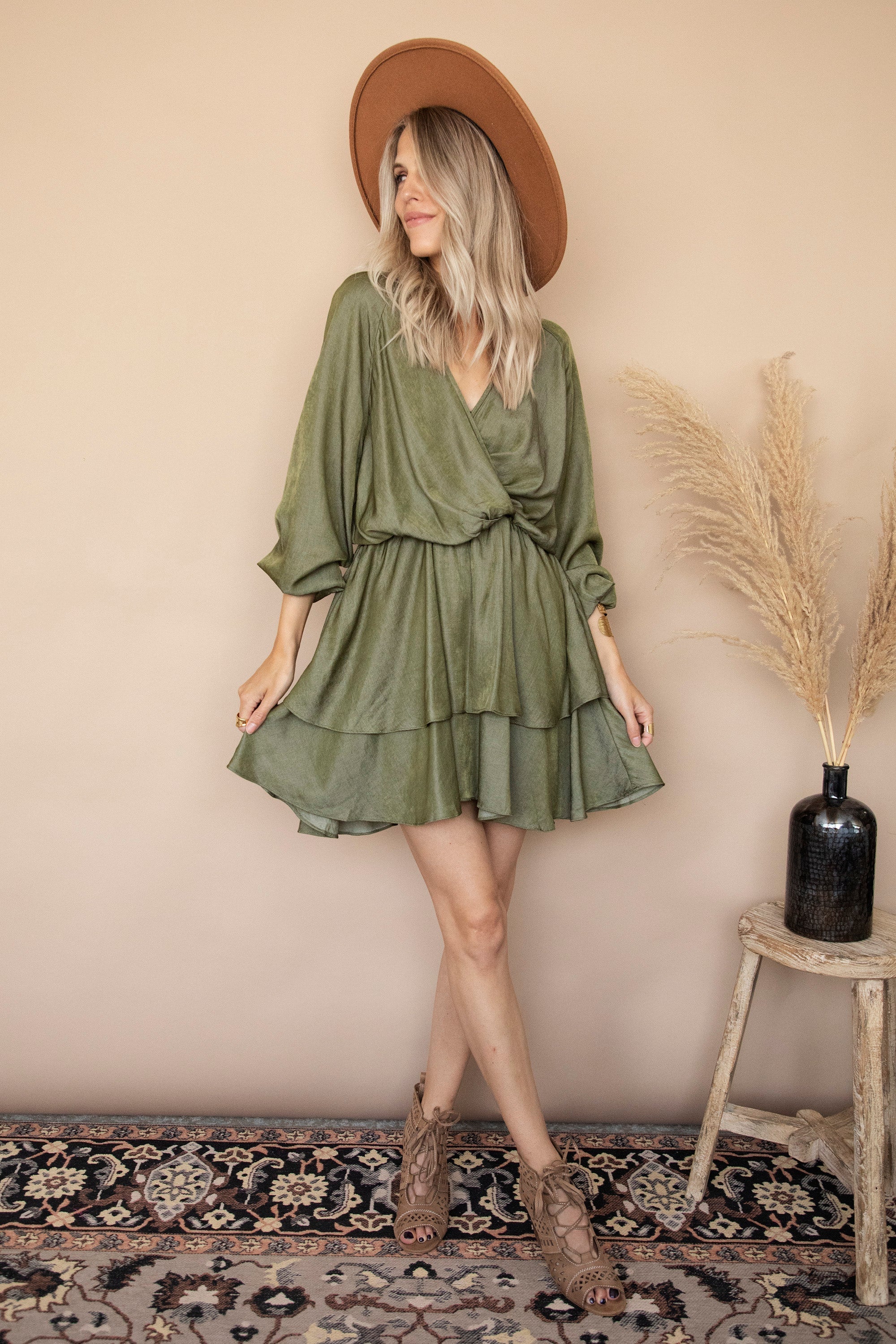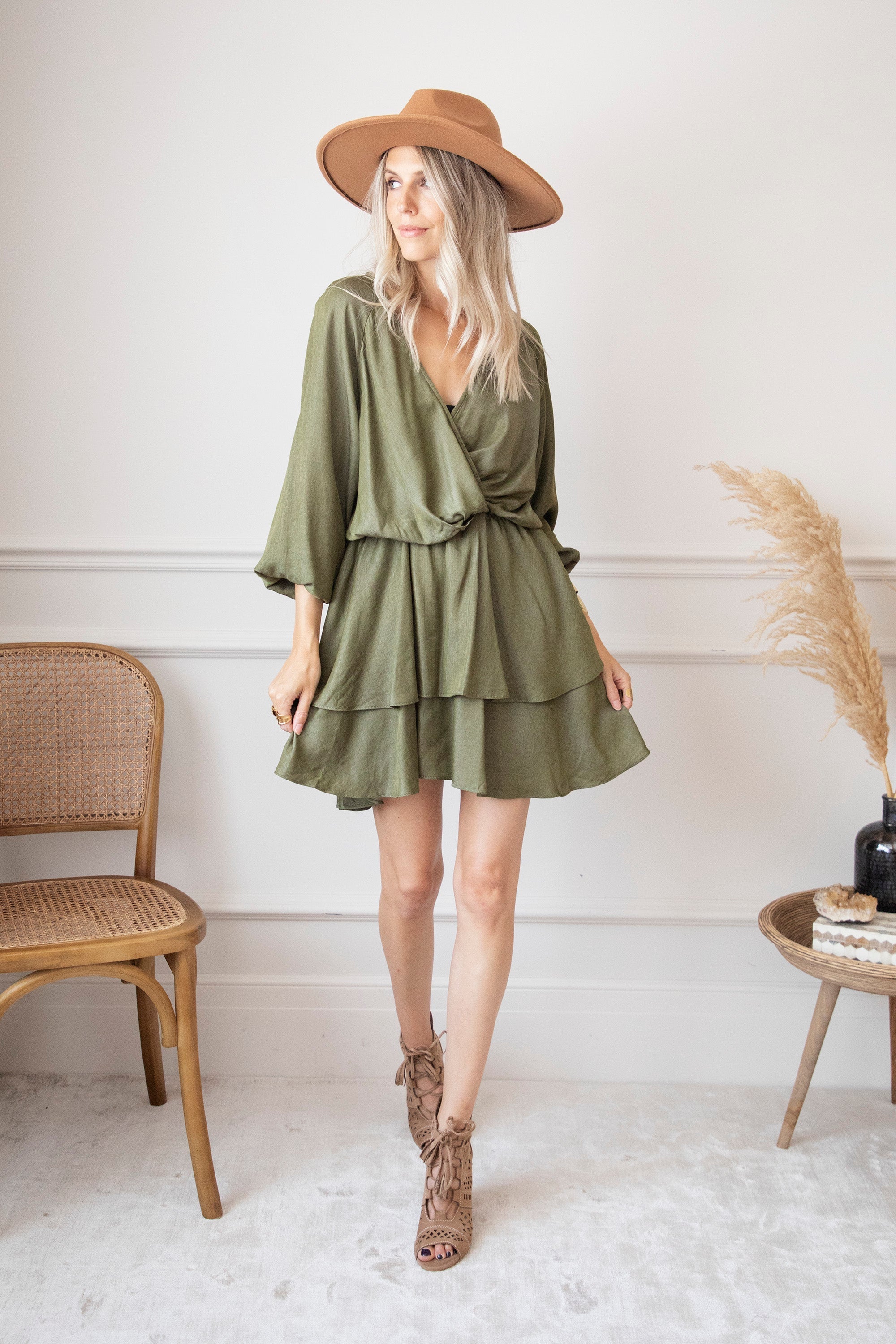 De jurk heeft een effen kaki kleur, maar als je goed kijkt zie je een prachtige glans in de stof! ✨ Super speciaal! De stof voelt tegelijkertijd heel zacht en toch stevig aan! Ideaal...