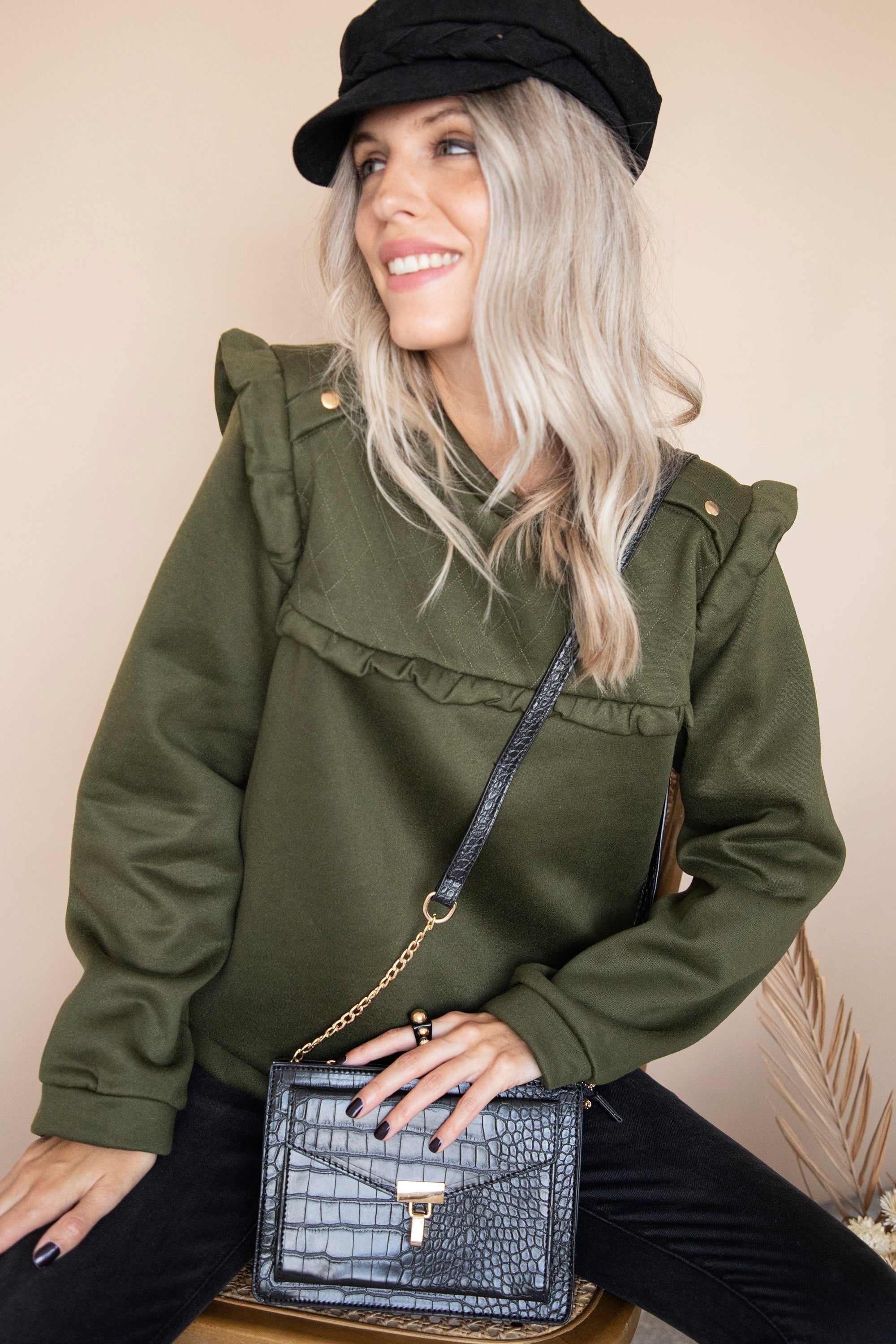Een zwarte skinny vind ik persoonlijk het leukst onder deze kaki sweaterĀ š¤ Oogt stoer! Zeker in combinatie met de zwarte cap š Je kan eventueel nog een stukje vooraan in de broek stoppen voor een casual styling š