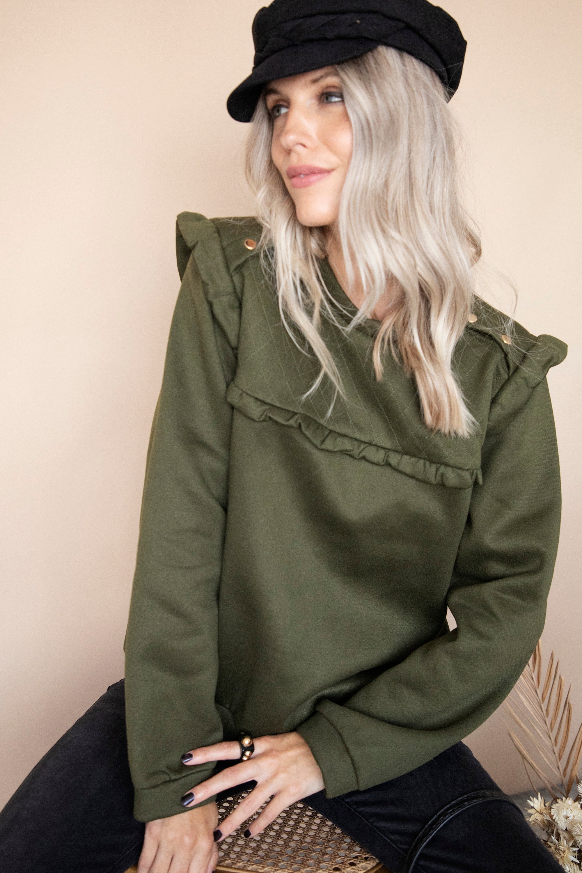 Een ander leuk detail is de gouden (druk)knopenrij aan beide schouders! Zo trek je de sweater super easy aan en uit š